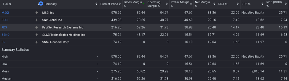 Financial firms incur substantial costs in cleaning, reconciling, and standardizing data from fragmented global sources. While FactSet maintains a strong absolute profitability, its margin reside in the median range relative to its closest peers.
