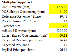 Based on the historical revenue for the fiscal year ended 2023 and the outstanding share count, we estimated the pre-disclosure price-to-sales (P/S) multiple to be approximately 1.12x revenue per share [3]. Using a base case assumption of a $300 million contract size, we project an accretion in revenue per share—taking into account the company's share repurchase program—of $86.49 per share. Assuming a constant sales multiple post-disclosure, the price per share reflecting this new information is estimated to be $96.91, slightly higher than our previous direct approach.