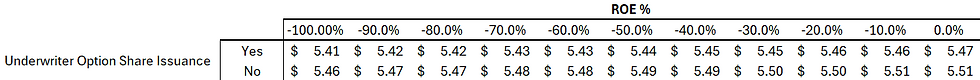 To address these assumptions, we provide the following data table, which presents per-share price estimates across various ROE % scenarios and incorporates the binary optionality associated with the underwriter options.